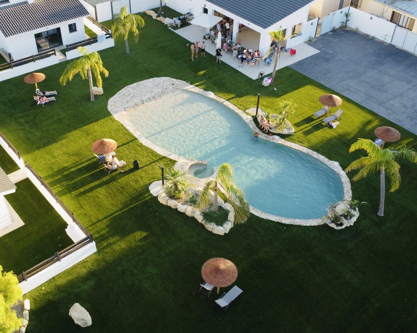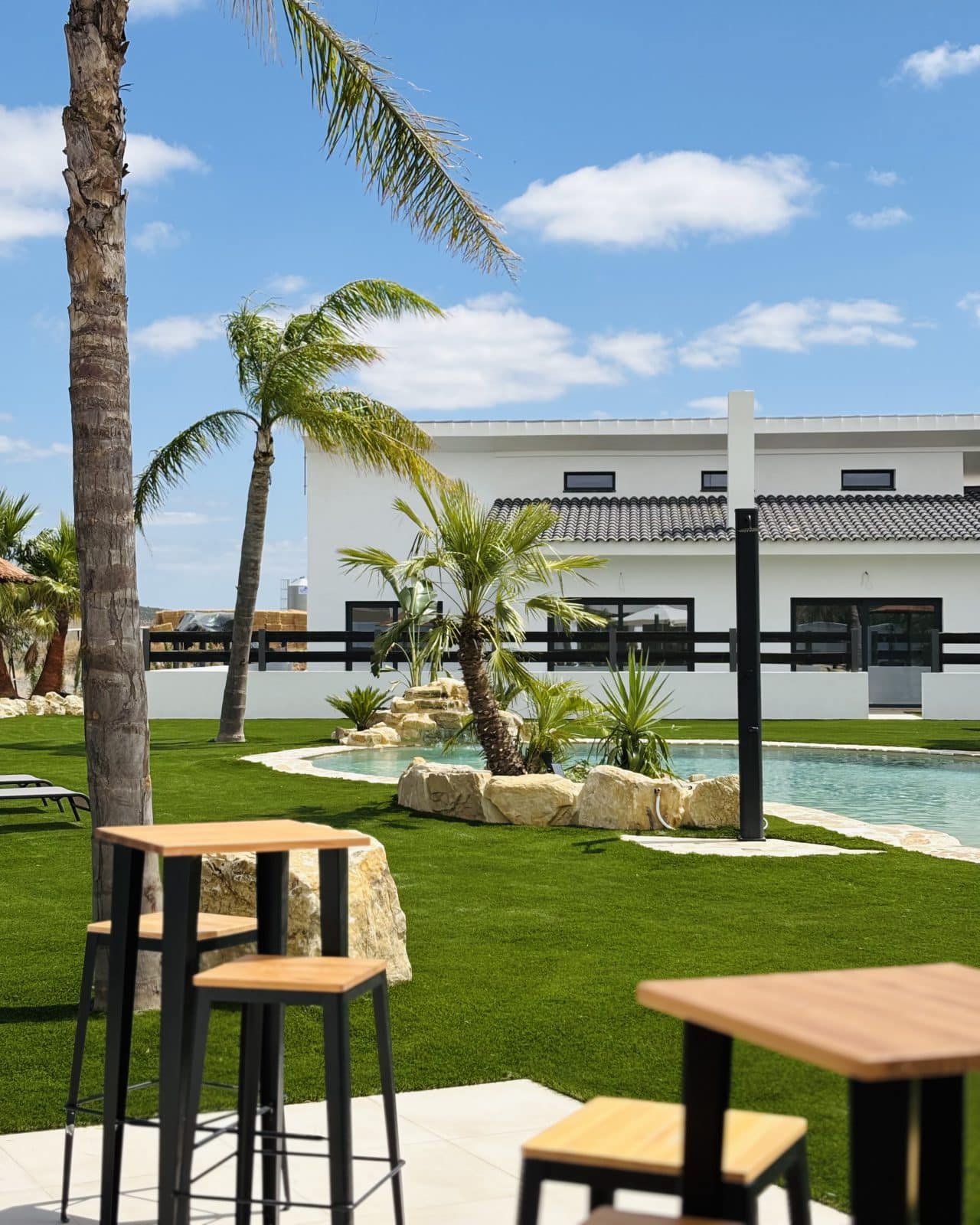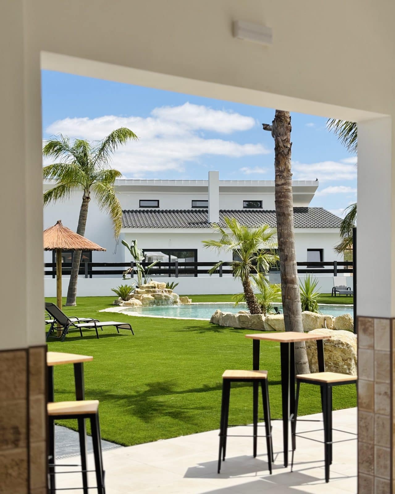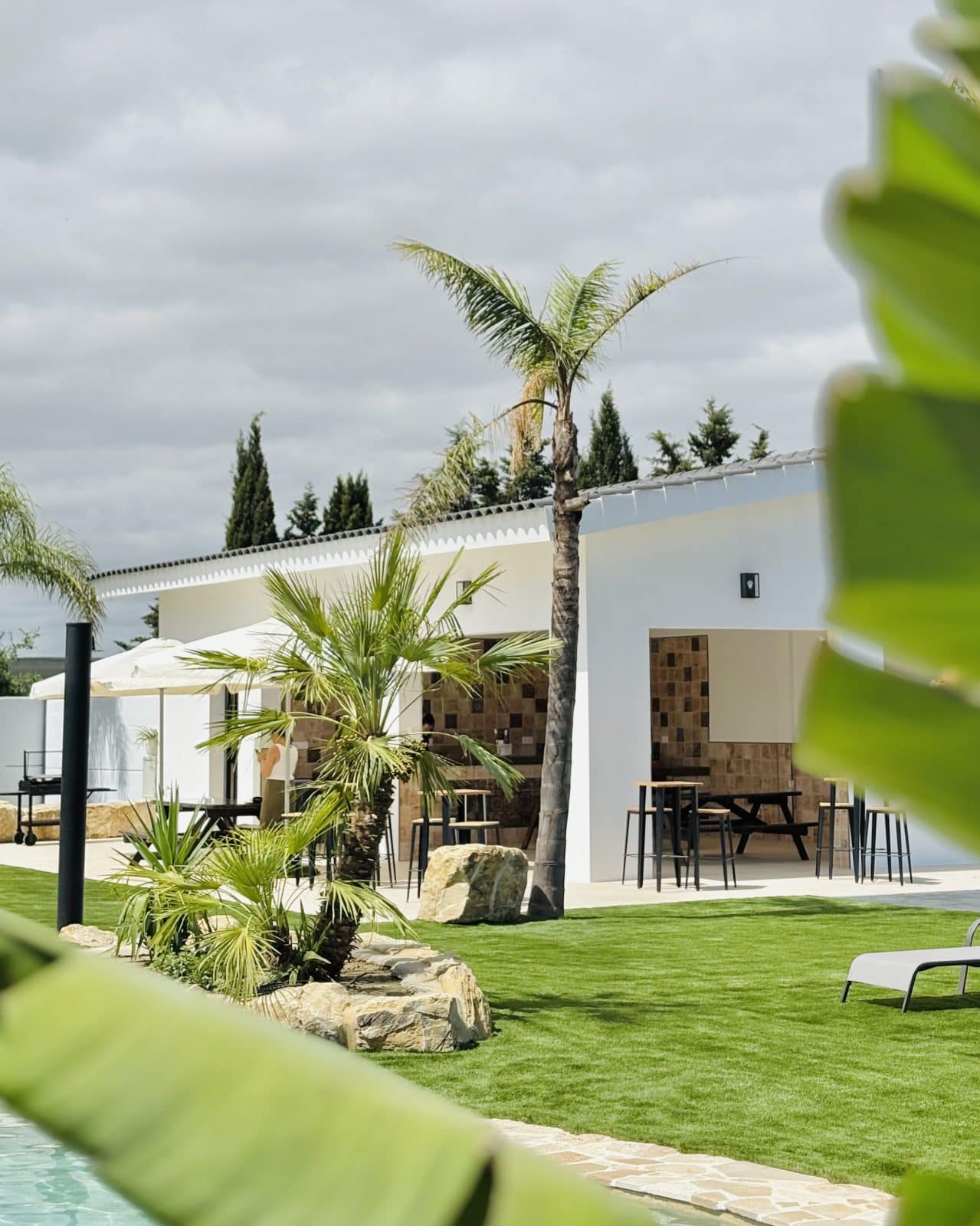Todo este equipamiento es de uso común para los huéspedes de las diferentes viviendas del complejo, convirtiendo la zona en el punto de encuentro perfecto para comidas, celebraciones informales o simplemente para alargar la sobremesa mirando a la piscina.