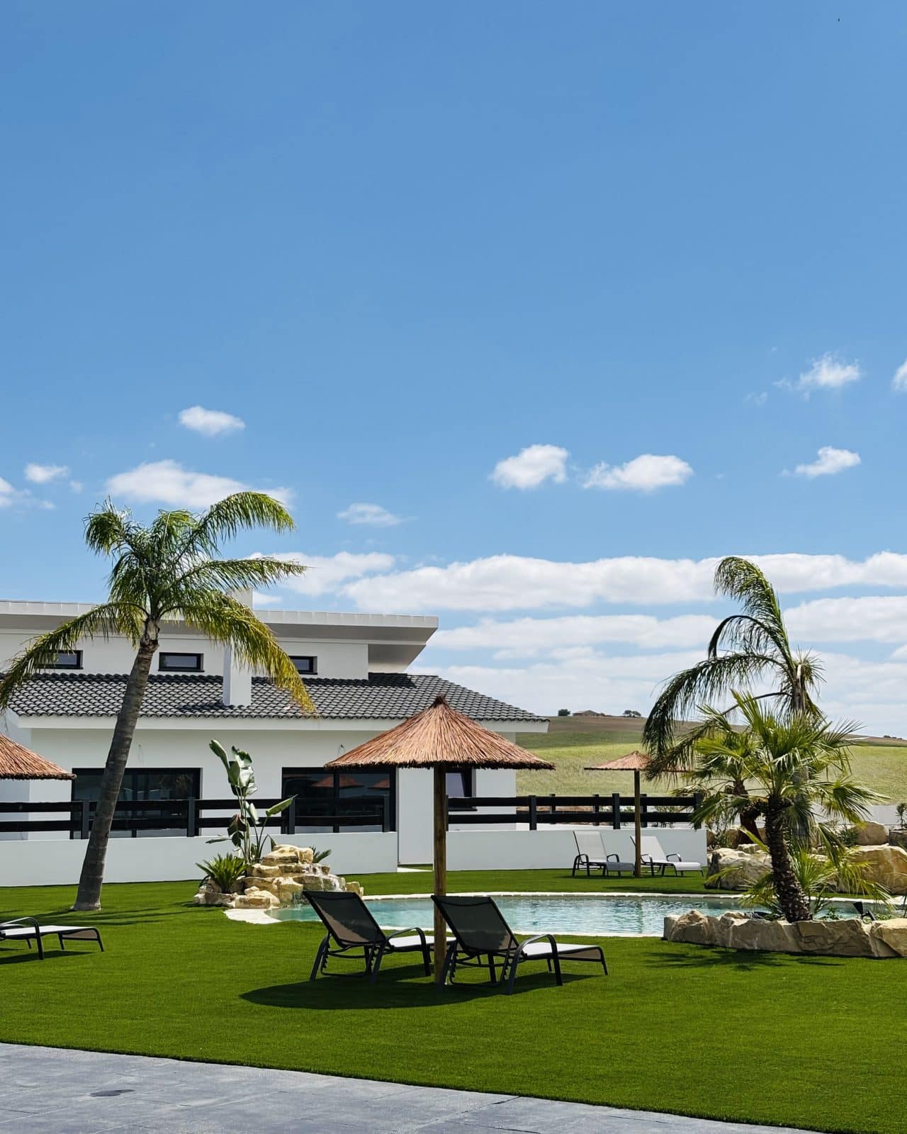 Todo el diseño de los espacios exteriores está planteado para que el complejo sea funcional, cómodo y muy visual, ideal tanto para familias como para grupos de amigos que buscan un alojamiento rural con piscina y zonas ajardinadas.